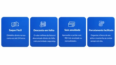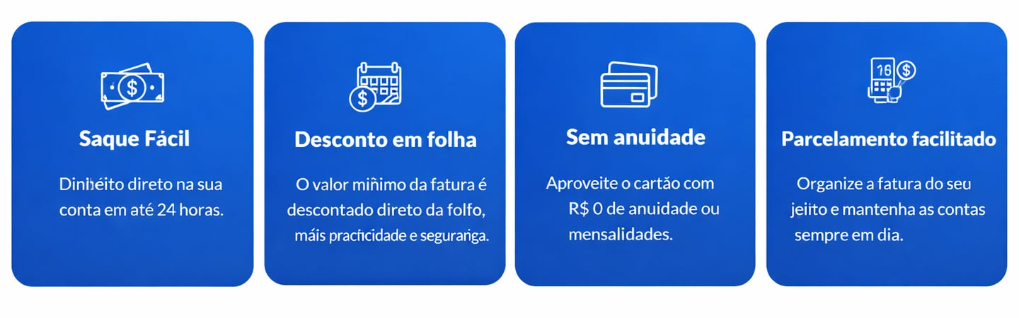 O Cartão de Benefício Consignado exclusivo para Servidores Públicos (concursados estaduais) ativos, aposentados e pensionistas, criado para facilitar o dia a dia. O pagamento mínimo é descontado diretamente na folha, e o limite é definido pela margem consignável disponível para o servidor.